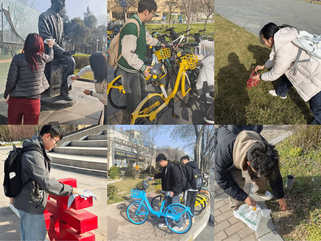 活动当天,志愿者们明确分工、协作配合,分为三支志愿服务队伍,同步开展多项志愿服务工作,用实际行动诠释雷锋精神的时代内涵。在守护校园清洁行动中,志愿者们深入校园绿化区域、礼仪广场、综合楼周边等公共区域,手持清洁工具,细致捡拾地面纸屑、塑料袋、烟头及各类杂物,认真清理卫生死角,不放过任何一处细节,用双手拂去尘埃,为校园换上洁净整洁的新面貌,用劳动践行奉献初心。在校园雕像清洁守护行动中,志愿者们怀着崇敬之心,细心擦拭教学楼前英雄人物雕像,除尘去污、细致养护,让雕像重现庄严整洁的风采。擦拭过程中,志愿者们认真学习雕像背后的英雄事迹,在实践中感悟榜样力量、传承红色基因,进一步坚定向英雄学习、向雷锋看齐的信念。在共享单车规范摆放行动中,志愿者们聚焦综合楼、餐厅门前、教学楼前等重点区域,对乱停乱放、挤占通行通道的共享单车进行统一整理、有序摆放,主动引导师生规范停放,切实维护校园交通秩序与通行安全,让文明之花绽放在校园每一个角落。