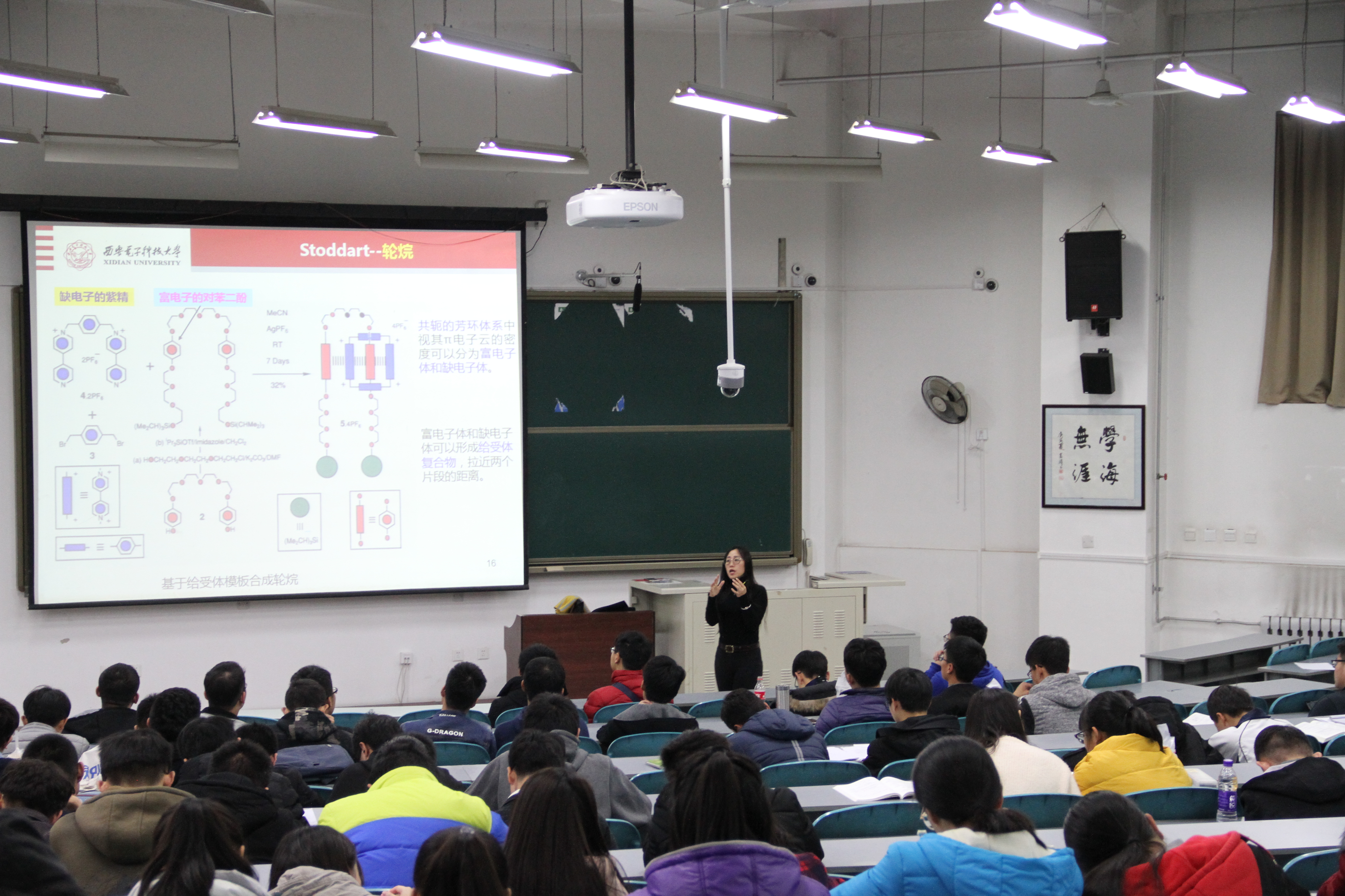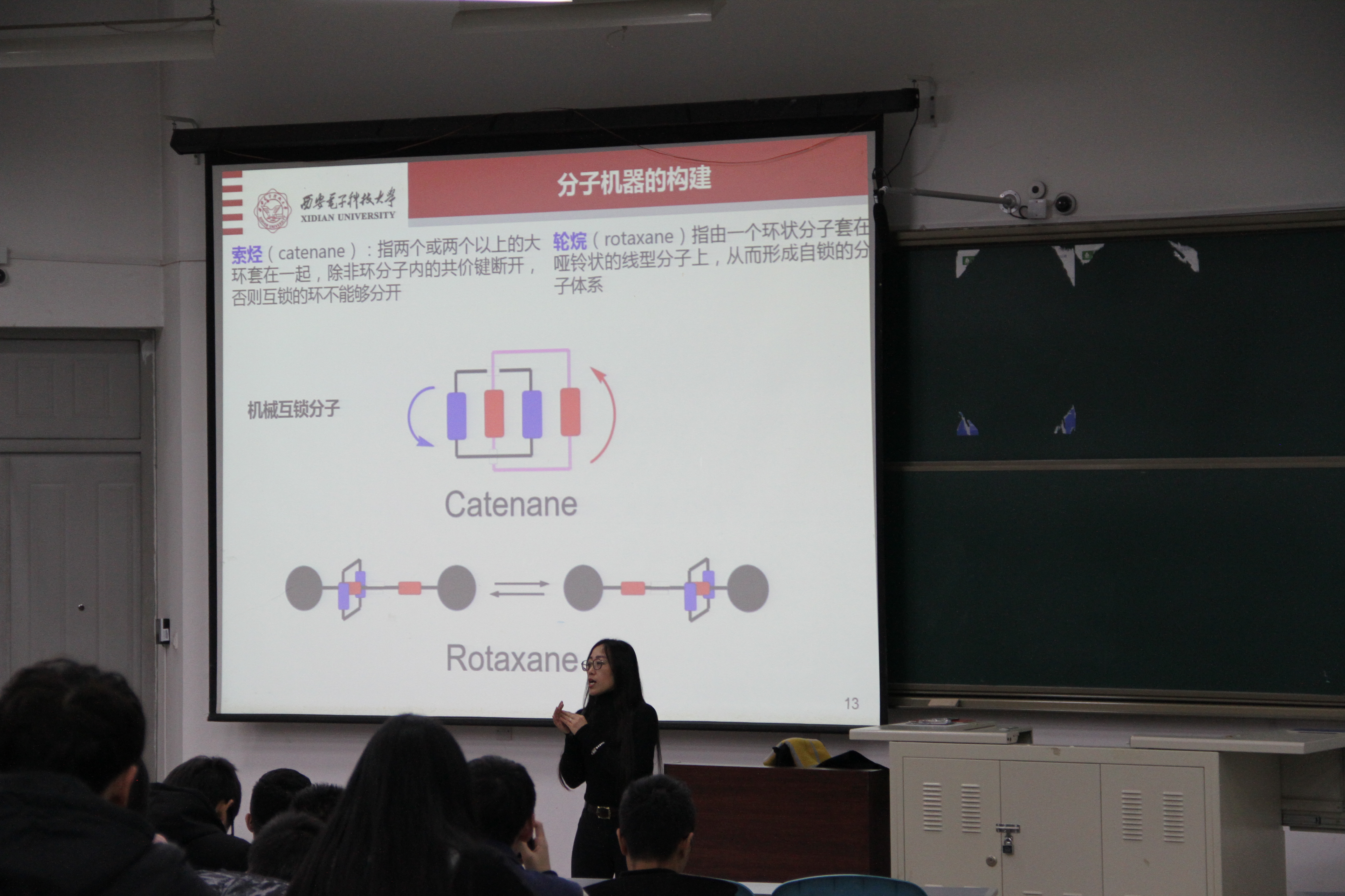 接下来,是对概念的讲解。白晓霞通过生动的阐述并结合演示,使原本抽象的分子机器变得具体化、形象化,让同学们都能很好地理解分子机器的内涵。随后,白晓霞深入介绍了分子机器的内部构建及其关键组成部分——索烃和轮烷,并对分子机器的应用领域进行了讲述,分子剪刀、分子马达、分子电梯……一系列形象的分子机器在同学们面前生动起来,同学们对分子机器的理解不断加深。最后,白晓霞给同学们阐述了分子机器的前景展望,用诙谐幽默的文字作为结束语的同时,她还向同学们描绘了分子机器在未来发展的无限前景。