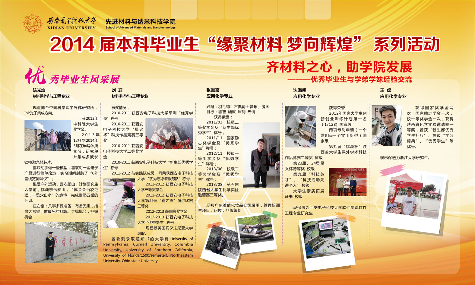 交流会于19点正式开始,材料院材料专业和化学专业共五位学长学姐出席了本次交流会。首先接受同学们提问的是材料专业的刘珏学姐,她在大学期间曾获得国家奖学金一次,校级奖学金若干次,并在大四上学期选择留学至美国宾夕法尼亚大学。她在回答学弟学妹们关于出国深造的问题时提到:一个人保持清醒的头脑是在留学道路上一个重要的素质,我们的本科生不能将出国留学当作神圣的、高不可攀的活动,而是当作自己开阔眼界、增长见识的途径,并时刻保持自己为国争光,报效祖国的信念。应用化学专业保送浙江大学的王虎学长曾数次获得“优秀员工标兵”的称号。他从生活、读研和老员工兼职三方面对学弟学妹们提出了自己的宝贵意见。他认为,必须看清楚上研或工作的本质,读研其实也是另一种工作平台或者说是另一种工作环境,要在为自己上研的奋斗过程中找准自己的目标和关注点,时刻提醒自己努力奋斗。随后,王虎学长分享了自己参加浙江大学夏令营的经历和经验。随着交流会的进行,材料院保送中科院半导体所研究生的陈光灿学长、竞赛达人沈海明学长和工作标兵张攀豪学长分别分享了自己的老员工活心得体会。