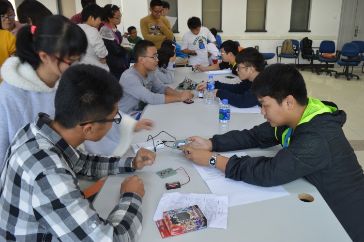 院赛过程中,由科协竞赛部成员负责为参赛作品贴上标签,然后参赛选手带上自己的作品由评委们鉴定。选手们井然有序地将自己的作品展示给评委,并讲解自己制作作品的目的,作品的构造及原理,评委们认真倾听选手们的讲解并一一给出意见,并指导选手们如何更好地完善自己的作品,选手们悉心听取经验,拓展自己的经验及科技知识。院赛场面热闹非凡,选手与选手间亦是相互交流,相互学习,共同进步。院赛涌现出了一系列优秀作品。