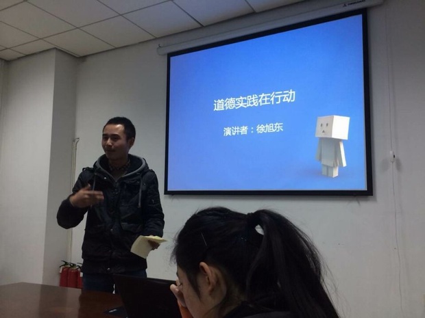 首先,由大一材料班郭冠男同学带来以“我眼中的西电”为主题的演讲,郭冠男语言流利,吐词清晰,简明扼要的表达了他对西电的看法在进校前与进校后的变化,演讲结束后,李天就郭冠男的演讲提了几个问题,郭冠男一一解答。接下来,李卫保、徐旭东、李艺男、何佩、席龙昌同学陆续为大家带来了关于自己所选主题的演讲,观众与评委都聚精会神地听着同学们的演讲。最后,由评委对参赛选手的演讲进行点评,张珊对参赛选手的演讲风格提出了建议;然后,李伟嘉表扬了大家对英语的热情;最后,由李伟嘉为获得此次演讲比赛的一、二、三等奖同学颁发奖状及奖品。