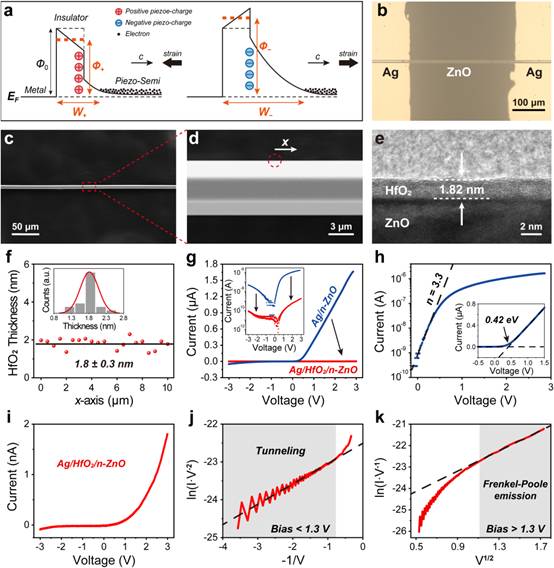 图1. (a)压电极化调控压电电子学隧道结的界面能带示意图。(b)压电电子学隧道结应变传感器的光学图像。(c,d)HfO2/n-ZnO纳米线的SEM图像。(e)沿(d)中的标记位置测试的HfO2/n-ZnO纳米线表面的高分辨TEM图像。(f)绝缘层HfO2的厚度统计图。(g)Ag/HfO2/n-ZnOPTSS和Ag/n-ZnOSSS的I-V曲线。(h)计算得出Ag/n-ZnOSSS的势垒高度约为0.42 eV。(i-k)Ag/HfO2/n-ZnO的I-V、ln(I∙V-2)与-1/V以及ln(I∙V-1)与V1/2关系曲线。