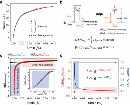 如图3 a所示,为了研究压电界面调控效应对隧道结势垒高度和宽度的影响,测试了器件5个周期的动态电流响应。为了便于分析,将图3b中的隧道结势垒等同于矩形势垒。图中的∆BH代表隧道结势垒高度的变化,∆BW代表隧道结势垒宽度的变化。基于图3 a中的电流响应曲线,绘制了ln(Istrain/Ifree)与应变的函数关系曲线(图3c),可得 ln(Istrain/Ifree)在红色区域随应变近似线性变化。基于压电电子学理论,受势垒高度变化影响的电流与应变线性关系,可知应变大于0.02%时,主导调控势垒的高度。由于应变对势垒宽度微弱的调控就会引起载流子隧穿几率发生明显的变化,会使ln(Istrain/Ifree)随应变发生很大的变化,因此图3c曲线中的快速变化的非线性段(应变小于0.01%)就可认为主要是应变主导调控势垒宽度。在图3c中的插图显示了蓝色区域的放大细节,表明了ln(Istrain/Ifree)和应变的指数形式之间的近似线性关系。这种关系与肖特基结器件的情况并不同,表明在 PTSS的隧道结中存在复杂的压电调控机制。基于势垒的高度和宽度与电流都有自然的指数关系,在图3 d中计算了应变引起的势垒高度和宽度的变化,结果显示0.07%的应变将导致有效势垒高度约 6.31 meV的变化。