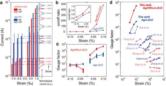 PTSS 和 SSS两种器件的“ON”态和“OFF”态电流的统计分布及其直方图(图4 a)表明,统计电流随拉伸应变的增大而增大,随压缩应变的增大而减小。这一趋势与 PTSS 和 SSS 的 I-V 曲线变化特征一致。虽然 PTSS 的“OFF”态电流比 SSS 的“ON”态电流小很多,但在0.10%的拉伸应变下,PTSS的“ON”态电流与SSS的“ON”态电流几乎达到了相同的量级,并且,PTSS 的开关电流是 Ag/n-ZnO SSS 的18.6 倍(图4 b)。GF 值代表压电器件的应变灵敏度,是应力/应变传感器件的关键性能参数。 GF 值越大,代表了器件的力传感性能越好。图4c-d对比总结了PTSS、SSS 和一些现有的基于ZnO纳米线或纳米带传感器GF值。基于Ag/HfO2/n-ZnO的PTSS与其他传感器相比,压电电子学隧道结应变传感器具有明显的优势,显示了其在应变传感方面的巨大潜力。