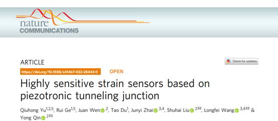 近日,西电世界杯官方网站入口2026先进材料与纳米器件研究所和兰州大学合作的研究成果以“Highly Sensitive Strain Sensors Based on Piezotronic Tunneling Junction”为题发表在国际知名期刊Nature Communications上。博士生于秋红为本文第一作者,西电世界杯官方网站入口2026为第一单位,通讯作者为兰州大学秦勇教授、刘书海副教授和中国科公司北京纳米能源与系统研究所王龙飞博士。