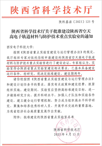 (通讯员 石文超)近日,陕西省科技厅发布《陕西省科学技术厅关于批准建设陕西省空天高电子轨道材料与防护技术重点实验室的通知》,世界杯官方网站入口2026牵头申报的“陕西省空天高电子轨道材料与防护技术重点实验室”获批立项建设,标志着公司高水平平台建设取得新进展。
