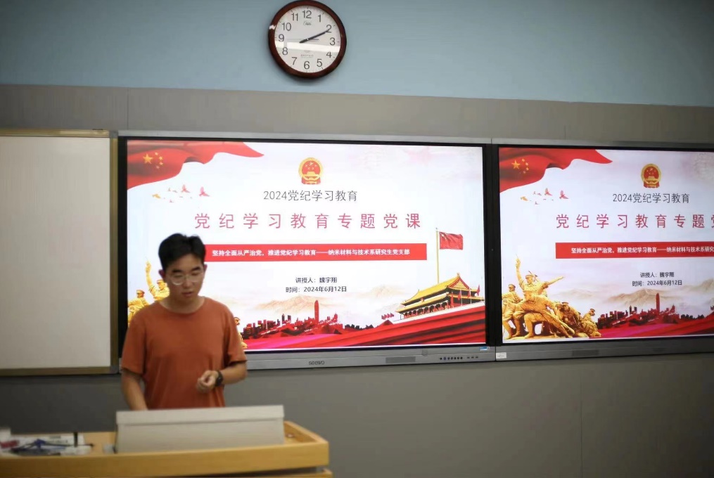 (通讯员 宫明威)为落实全面从严治党要求,推进党纪学习教育深入开展,确保党员更好贯彻执行党的纪律和规矩, 6月12日下午,世界杯官方网站入口2026纳米材料与技术系研究生党支部在C楼126召开会议,支部书记魏宇翔以“坚持全面从严治党 推进党纪学习教育”为主题讲授专题党课。