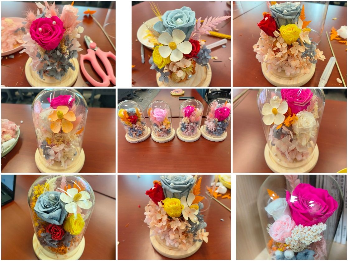 永生花,又被称为“永不凋谢的鲜花”,寓意美好,让人感到恒久不变的情感与祝福。活动伊始,指导老师从花卉选择、颜色搭配、花枝修剪及摆放等方面,讲解基本制作流程。在指导老师的帮助下,活动现场气氛活跃,大家边看边学,边交流边探讨,充分发挥自己的想象力,精心挑选和搭配花束,将一朵朵普通的花材变成一件件错落有致、独具匠心的永生花作品。大家对自己的作品爱不释手,纷纷拿出手机记录美好时刻。