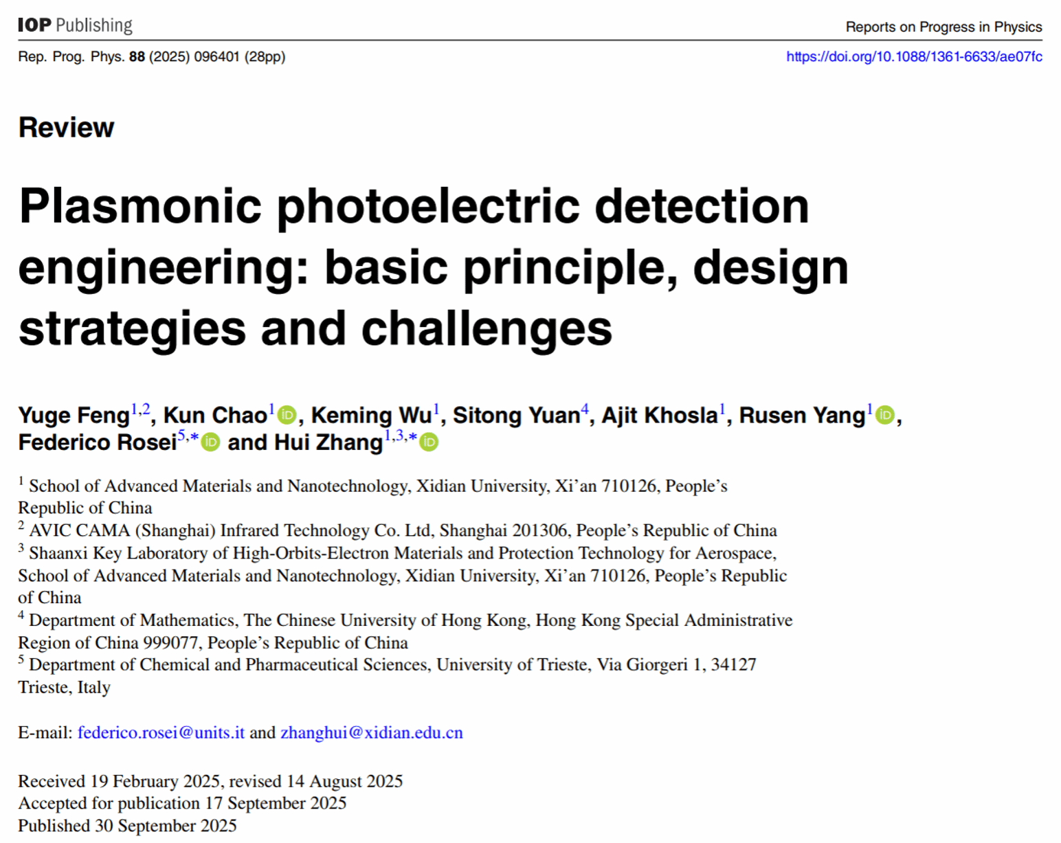 (通讯员 陈涛)2025年9月,世界杯官方网站入口2026张辉老师和意大利的里雅斯特大学Federico Rosei教授(欧洲科公司院士,加拿大皇家科公司院士,加拿大工程院院士,发展中国家科公司院士)合作受邀以“Plasmonic photoelectric detection engineering: basic principle, design strategies and challenges”为题,在影响因子为20.7的物理类国际顶级期刊Reports on Progress in Physics上发表了综述论文。