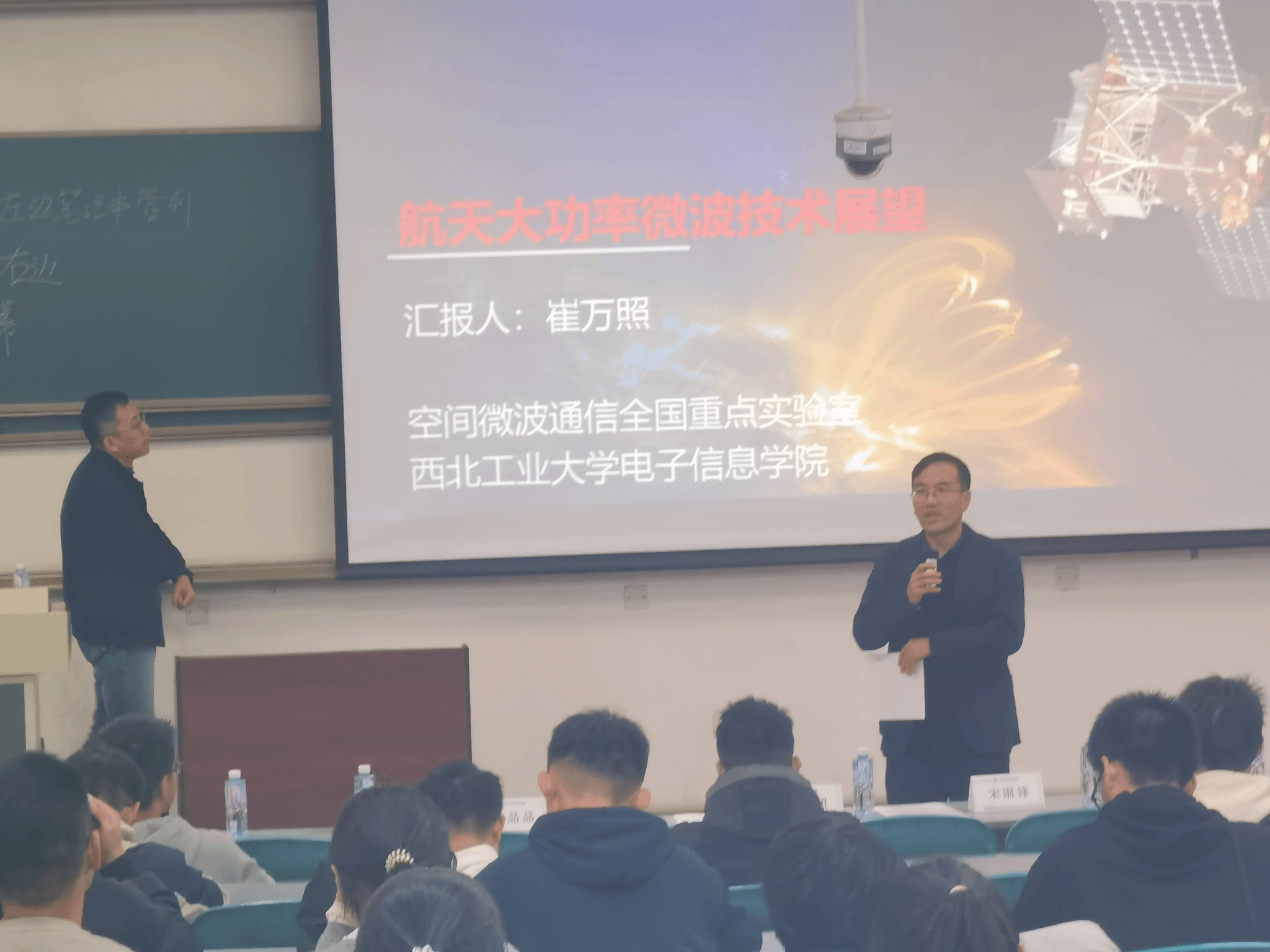 在互动环节中,现场师生围绕航天大功率微波技术的学术难点与工程应用问题踊跃提问,气氛热烈。崔万照研究员结合多年系统工程实践经验,以具体项目案例为支撑,用通俗的语言拆解复杂技术问题,既解答了师生的疑问,又引导大家从“理论-材料-器件-系统”的全链条视角思考问题,现场掌声不断。