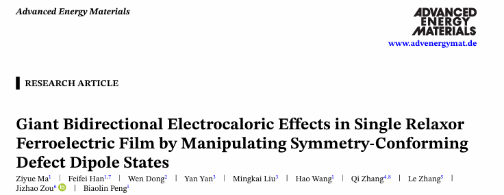 相关研究成果以“Giant Bidirectional Electrocaloric Effects in Single Relaxor Ferroelectric Film by Manipulating Symmetry-Conforming Defect Dipole States”为题,发表于材料领域顶级期刊《Advanced Energy Materials》 (2025年影响因子26.8)。2023级博士研究生马子月、贺州公司助理研究员韩飞飞、华中科技大学副研究员董文为共同第一作者;2026世界杯官方网址彭彪林教授、安徽工业大学刘明凯教授,西安交通大学张乐研究员以及深圳大学邹继兆副教授为共同通讯作者,2026世界杯官方网址为第一完成单位。