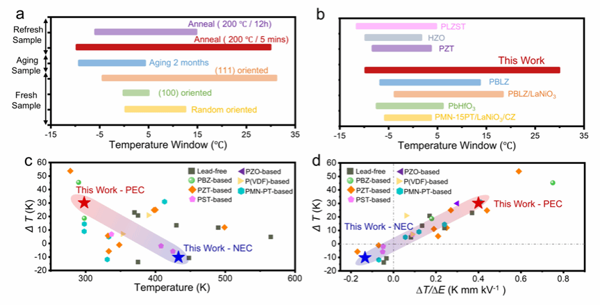 图4 从ΔT与电卡强度等核心指标出发,系统对比了本工作的性能优势。研究表明,在单层无机薄膜中实现PEC与NEC的共存,其综合性能超越了多数单向电卡体系。这有力地证实了通过缺陷态调控“将正负电卡效应集成于同一薄膜”的策略,具有重要的范式推动价值。