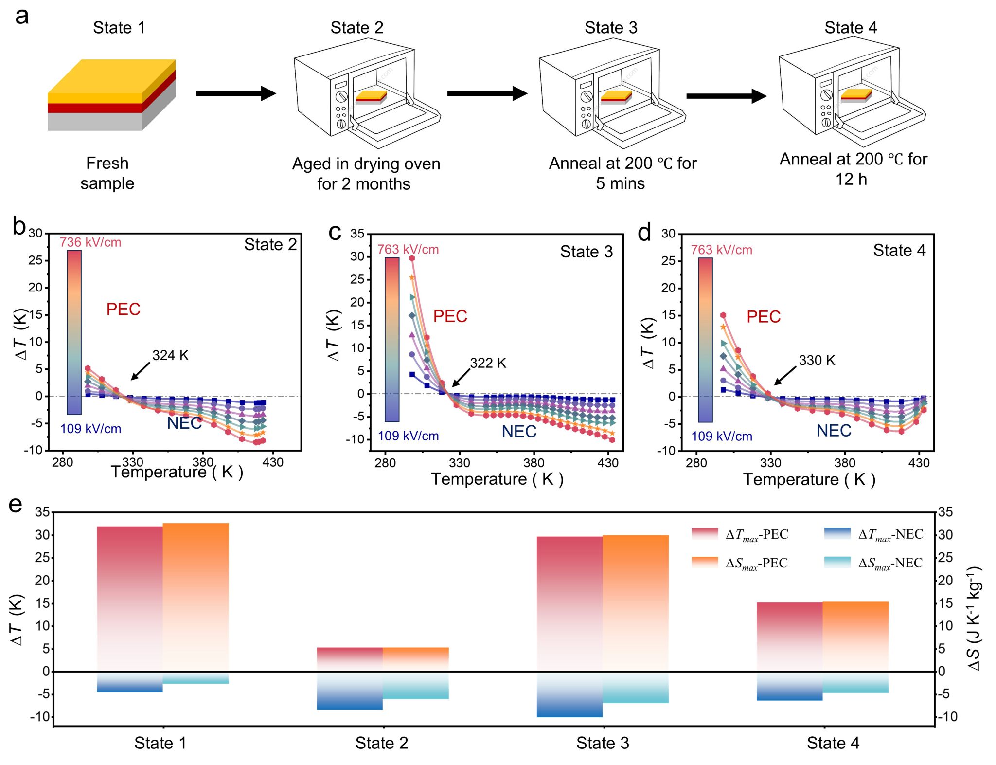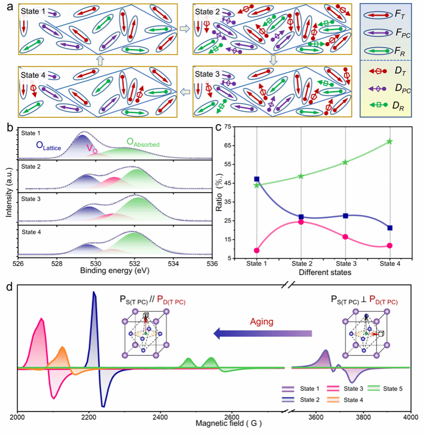 图2 系统揭示了“老化处理”对缺陷偶极状态与电卡温区的调控规律:样品经历不同的时效过程后,其缺陷偶极的对称性匹配状态随之改变,从而实现了负/正电卡效应温区(NEC/PEC)的显著迁移与拓宽。该结果为基于电卡效应的“可编程热管理”提供了关键实验依据。