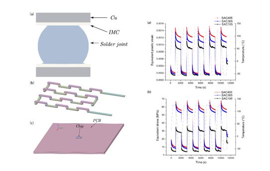 众所周知,我国在航空航天、武器装备、民用电子等领域内对器件与封装的高可靠性存在巨大需求。当前,国内对典型封装结构和元器件的可靠性预计多以单应力条件为主,然而,在电子系统的实际工作环境中,除了电场、温度场的影响之外,还应考虑振动、辐射等多场的耦合作用。因此,在本文的工作中,选取了由三种无铅焊料(SAC105,SAC305,SAC405)组成的BGA菊花链式封装结构为研究对象,以有限元分析方法为研究手段,首先确定了电-热循环载荷条件下由塑性应变引起的断裂为焊点失效的主因,再基于修正的Coffin-Manson模型求出三种焊料寿命的大小关系,并从应变能的角度进行了解释。在此基础上,利用Manson 高周疲劳经验公式,Steinberg 模型与三带理论共同求解随机振动载荷下的应力-应变关系。最后,以线性损伤叠加法预计了电-热-振动三场耦合下三种焊料寿命关系。