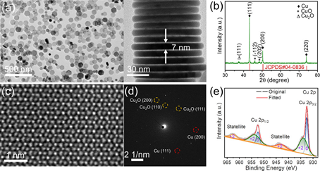 实现碳达峰碳中和,是我国的重大战略决策,其关键是坚持生态优先、绿色低碳发展。氨是重要的工农业原料,也是潜力巨大的无碳能量载体。然而,目前全球氨的合成氨主要采用哈珀法,不仅能耗高,还会导致大量的温室气体排放。据统计,平均每生产一吨氨,排放约两吨二氧化碳气体。因而,开发“绿氨”制备技术,取代工业“灰氨”极为重要。同时,人类活动的增加和含氮肥料的过度使用已经导致地下水中硝酸盐积累,造成了严重的引用水污染,对人类的生命健康造成了严重的威胁。电催化还原硝酸盐合成氨是一种潜力巨大的清洁技术,其利用电催化的方法将污水中的硝酸根转化为氨,不仅能解决化工能源问题,而且可以有效缓解饮用水安全问题。因电催化还原硝酸盐合成氨的过程需要多电子和质子的参与,极易产生亚硝酸盐、氮氧化物、氮气等副产物。同时,在电催化过程中,其产氨选择性会受到析氢反应的严重制约。铜是电催化硝酸盐还原的高活性催化剂,然而具有均匀尺度的铜纳米结构的可控批量制备仍然是一大挑战,导致硝酸盐还原制备绿氨的反应机理缺乏统一的认识。基于此,研究人员首次合成了高活性和选择性(111)晶面暴露的均匀铜纳米片,结合XPS和STEM分析,发现直径为80 nm、厚度为7nm的Cu纳米片表面存在部分氧化的情形。