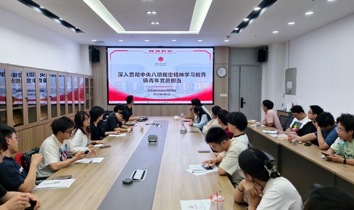 (通讯员 李佳泽)为开展深入贯彻中央八项规定精神学习教育,强化毕业生党员党性修养与纪律意识,筑牢理想信念根基,6月6日,先进材料与纳米科技学院本科生党支部在G楼142会议室开展“铸青年担当”主题党日活动。通过专题党课、党员分享、重温誓词等环节,为毕业生党员上好离校前的“纪律必修课”。