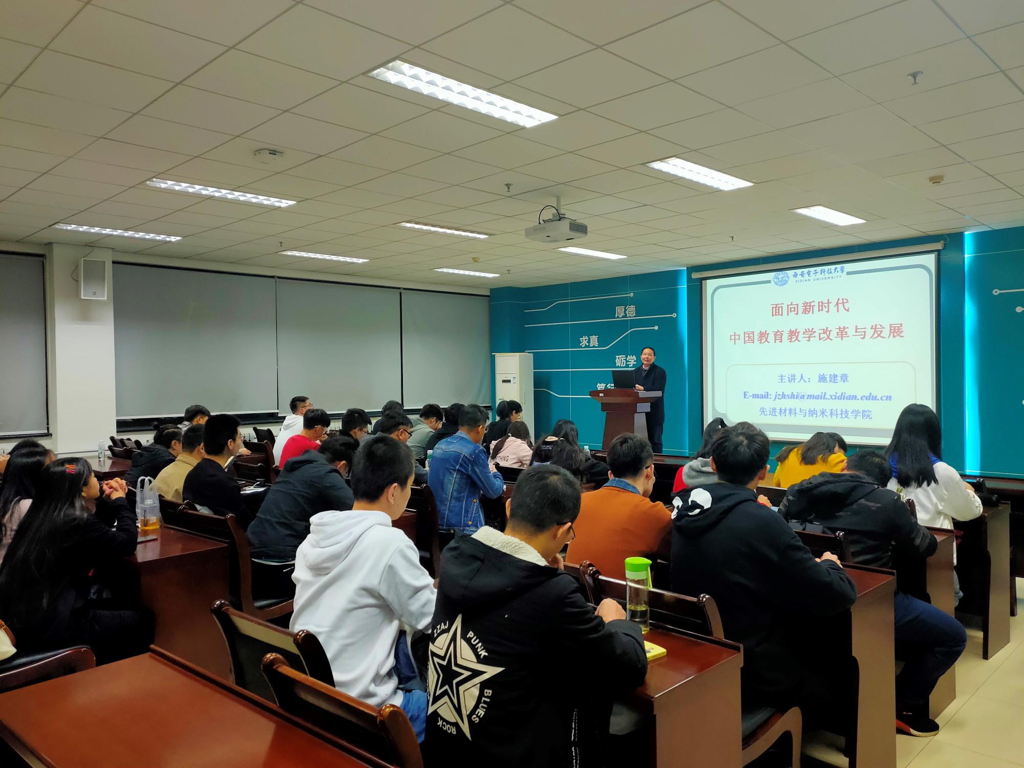 最后,施建章建议老员工党员要不忘初心、牢记使命,时刻保持危机感,正如“逆水行舟,不进则退”,要设定自己的短期和长期目标,并为之奋斗。作为一名教育工作者,他告诉我们教育的真谛是“千教万教教人求真,千学万学学做真人”,强调要做学问必须先学会做人,这得到了同学们一致的认同。
