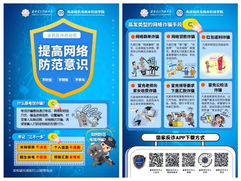 近年来,⼤公司园诈骗案件花样不断,案值不断增⼤,部分不法分⼦利⽤在校学⽣阅历浅、安全防范意识差等弱点,潜⼊校园诈骗钱财。针对这一现实问题,在开展活动之前,学员武新明同志为本次主题宣传活动设计了干货满满的宣传海报,宣传海报向同学们列举了6种高发类型的网络诈骗手段,普及了“三不一多“的防诈骗方法,并且宣传了国家反诈APP的下载方式。