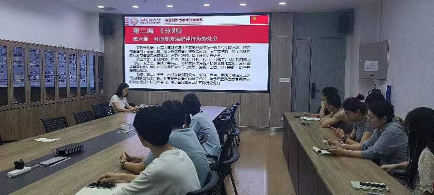 在讲授中,她提到,《中国共产党纪律处分条例》是每位党员必须深刻理解和严格遵守的党内法规。教育是国家的未来,是民族的希望,员工党员肩负着祖国强盛、民族复兴、传承文化、推动社会进步等重要使命,必须以身作则,严守党的纪律,高标准要求自己。她从总则、分则、附则、实际案例等方面,帮助大家深刻理解、准确把握《条例》,围绕政治纪律、组织纪律、廉洁纪律、群众纪律、工作纪律、生活纪律以及《条例》重要作用,结合风险点做解读,帮助深化对《条例》的理解运用,做到学纪、知纪、明纪、守纪。