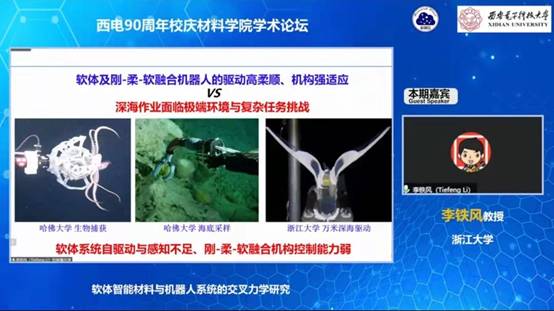 李铁风教授的报告题目为《软体智能材料与机器人系统的交叉力学研究》,报告中,他向大家介绍了软物质的概念与软体机器人的产生背景,结合团队项目讲解了“人工肌肉”驱动原理与控制策略,分析了深海极端环境下新型材料的设计合成,为深海机器人的设计思路带来了革命性的突破。李铁风教授依据“深海狮子鱼”仿生启发提出系统压力自适应构造原理的相关研究成果已发表在国际顶级期刊《Nature》并作为封面论文刊登。报告结束后,线上线下的听众均表示李铁风教授的报告令人大开眼界,研究成果做到了“将论文写进祖国的深海里”。