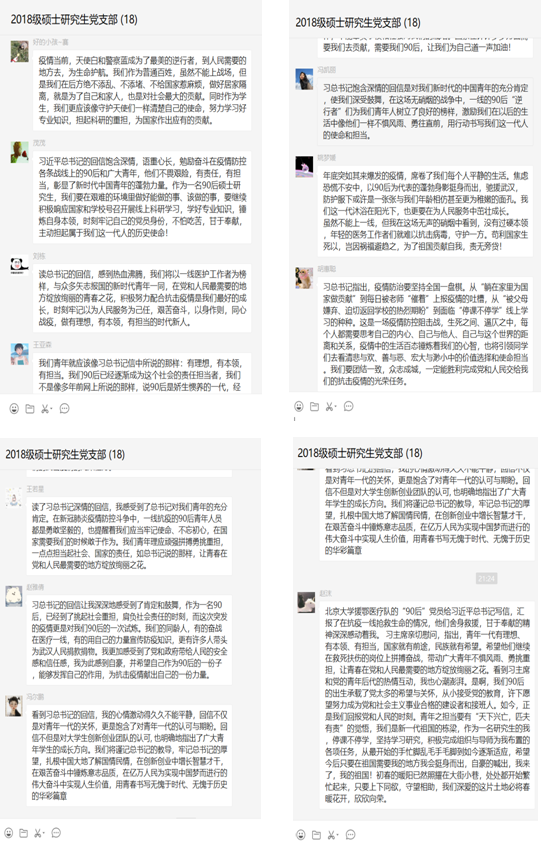 这次疫情让我们深刻体会到了时代赋予青年的责任与使命。2018级硕士党支部全体党员将深刻领会习近平总书记回信的重大意义和精神实质,以模范为榜样,发扬艰苦奋斗的崇高精神,争做党和人民信赖的栋梁。我们将在自己的位置上励志勤学、担当奉献,学好专业知识,发挥优势能力,珍惜学习时光,练就过硬本领,成为有理想、有本领、有担当的中国青年,让青春在党和人民最需要的地方绽放绚丽之花,用服务和奉献实现精彩的人生价值!