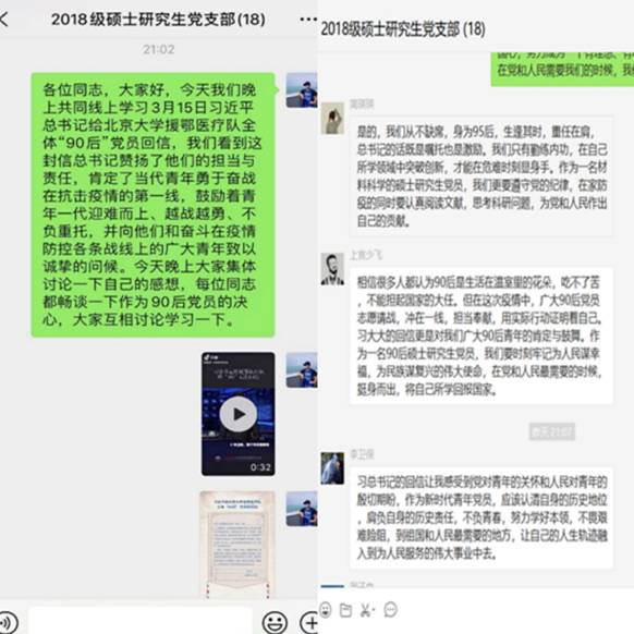 3月15日,中共中央总书记、国家主席、中央军委主席习近平给北京大学援鄂医疗队全体“90后”党员回信,在信中赞扬了他们的担当与责任,肯定了当代青年勇于奋战在抗击疫情的第一线,鼓励着青年一代迎难而上、越战越勇、不负重托,并向他们和奋斗在疫情防控各条战线上的广大青年致以诚挚的问候。3月19日晚上,2018级硕士党支部开展线上集体学习此次回信精神,并展开积极讨论。