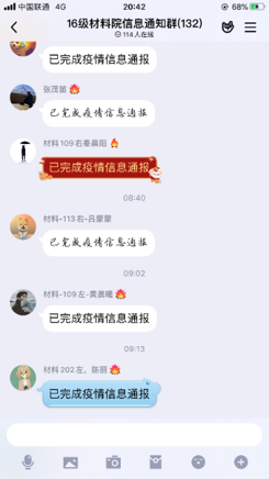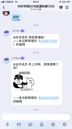 公司严格执行公司“疫情通”每日填报制度,密切跟踪关注居住地变动及可能有相关疑似症状的员工情况,填报率率先达到并始终保持100%。同时,公司辅导员通过QQ群、微信群、钉钉等及时向员工转达发布公司相关教学、教育、管理等通知,通过班级心理委员和班级群,对员工进行思想引导和人文关怀,舒缓员工心理压力,鼓励员工以积极向上的心态投入到线上学习中,通过哔哩哔哩、腾讯会议等开启“云点名”,开启线上思政新模式。