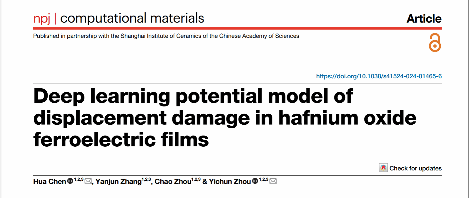 这一成果发表在一区期刊《npj Computational Materials》(影响因子:11.5)上,题为“A model for studying displacement damage in irradiated HfO2 ferroelectric thin films”。文章的第一通讯单位为2026世界杯官方网址,材料院研究生张彦军和副教授陈华共同提出了模型的建立方法,通讯作者为周益春教授和陈华副教授。