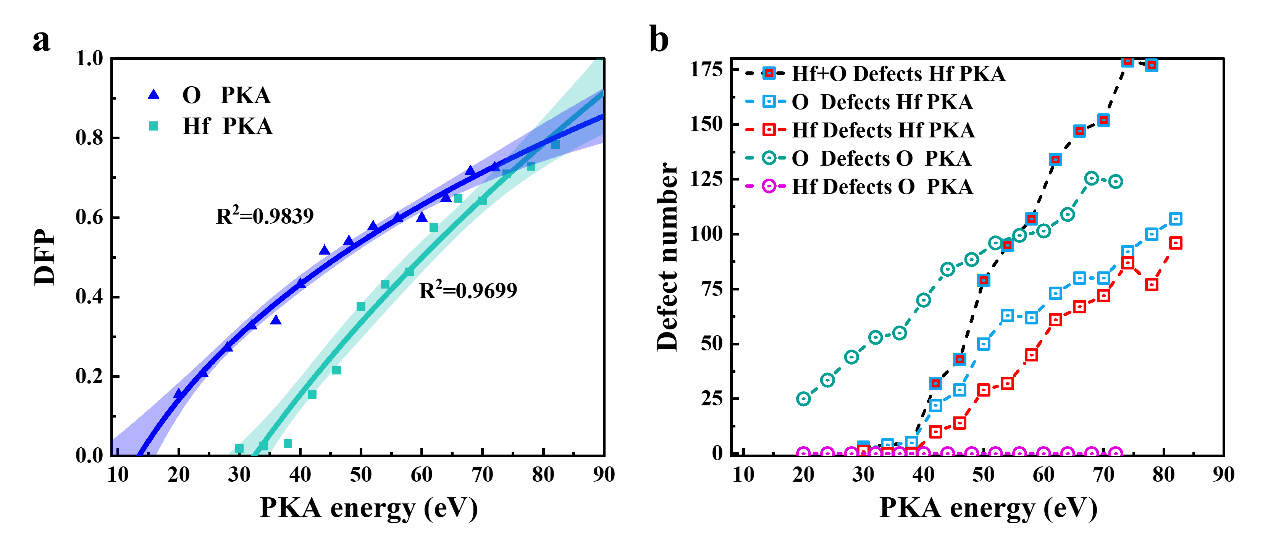 随着初级碰撞原子(PKAs)能量的增加,氧原子PKAs和铪原子PKAs的缺陷形成概率(DFP)逐渐升高,并在高能量时趋于1。在能量低于80.27 eV时,氧PKAs更容易形成点缺陷;而能量高于此阈值时,铪PKAs的缺陷形成概率更高,因为氧PKAs更倾向于形成替换环,一定程度上,抑制了点缺陷的生成。