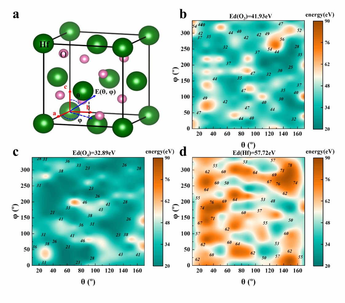 所建立的模型能够准确预测HfO2中多种晶相的性能,包括PO相(Pca21), T相(P42/nmc), AO相(Pbca), 和M相 (P21/c),更重要的是可以精确描述辐照过程中原子碰撞分离的动态过程,保证了用于预测辐照位移损伤时的准确性。计算出铪原子、三配位氧原子和四配位氧原子的位移阈值能量,分别为57.72 eV、41.93 eV和32.89 eV,这是描述位移损伤的主要特性。